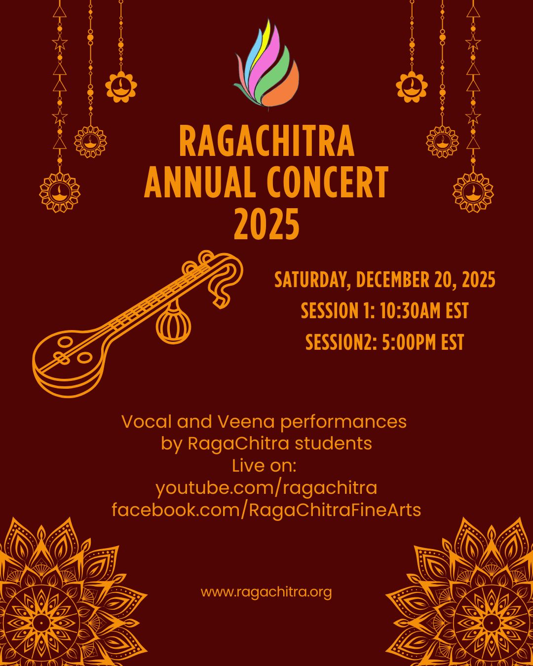 RagaChitra Fine Arts proudly presents it’s annual student showcase with vocal and veena concerts of it’s talented students. Students from all over USA, Australia and India will perform live in the event that will be live streamed on YouTube and Facebook.